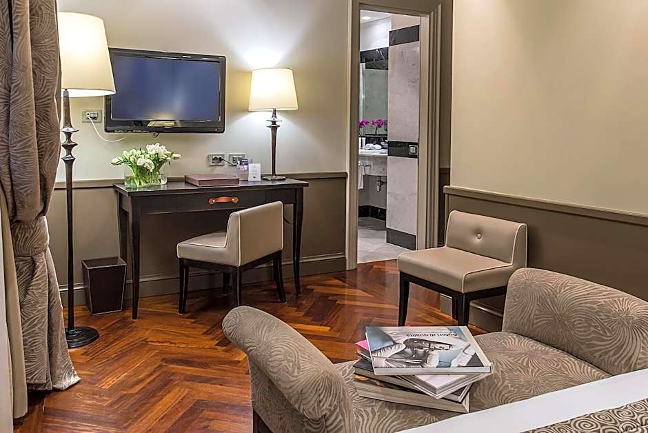 Two elegant connecting rooms with 2 bathrooms. The large marble bathrooms include shower, hairdryer, free toiletries and a telephone. Offers free Wi-Fi and a 32” LCD TV.